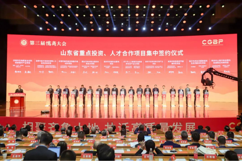开幕式上举行了山东省重点投资、人才合作项目集中签约仪式,集团董事长魏孝新与中国工程院院士代表肖少良就“仿生无醛胶黏剂及系列新材料项目”进行签约。