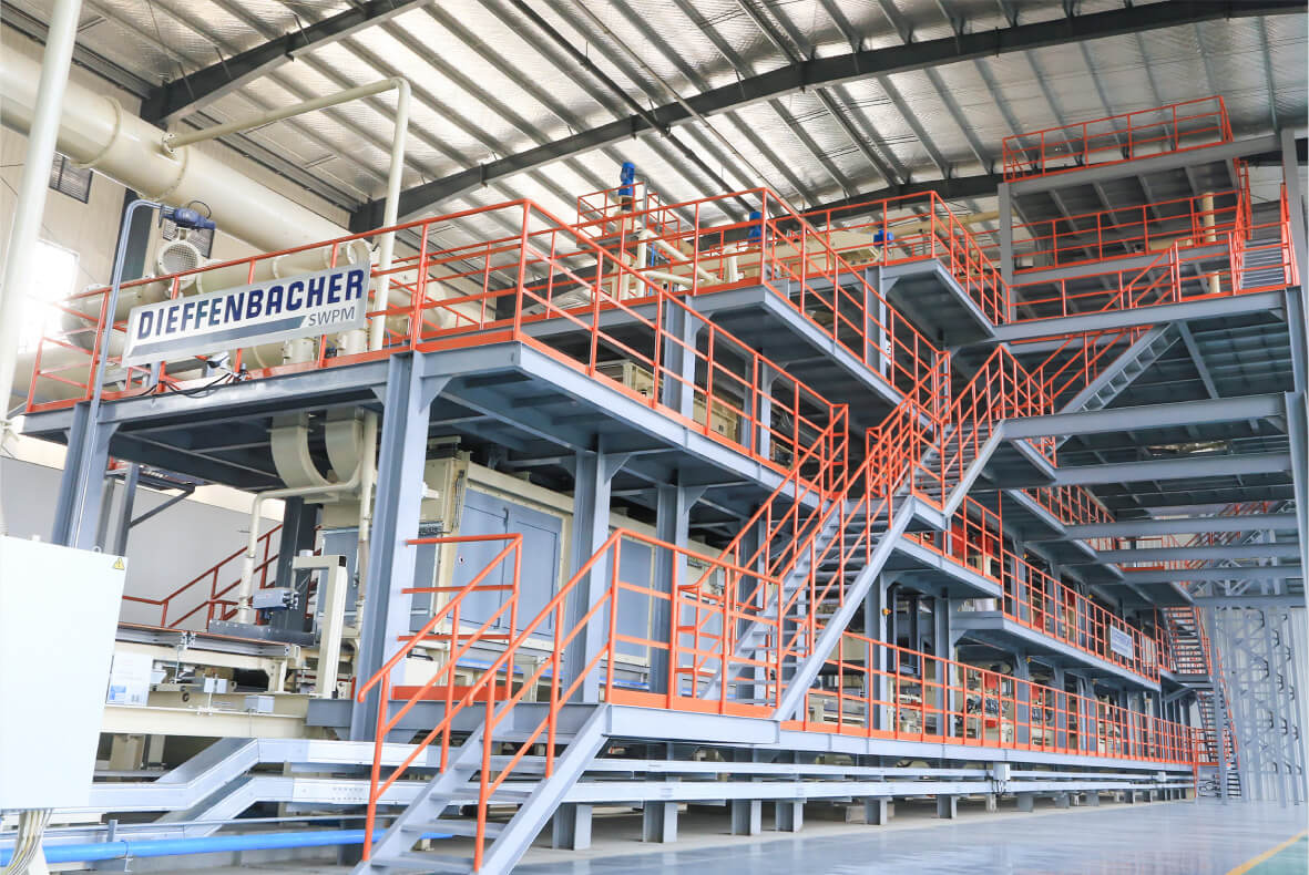 新港超强刨花板项目引进山东省首条迪芬巴赫生产线,采用格鲁巴斯超级刨片机,意大利帕尔超级刨花筛、气流风选机,迪芬巴赫在线施胶、拌胶系统,迪芬巴赫表层气流铺装机,迪芬巴赫连续压机系统,同步国际水平,引领行业发展。